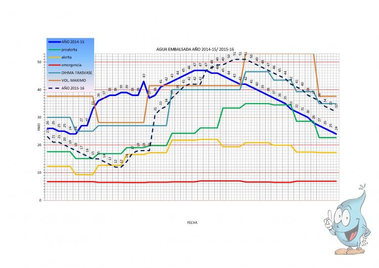 A esta buena noticia relativa al consumo, se ha sumado el nivel de normalidad de agua embalsada que alcanza el embalse de Beleña en este comienzo del otoño. Este período coincide con el fin del año hidrológico, que se computa entre el 1 de octubre de 2015 y el 30 de septiembre de 2016. Con respecto al año anterior, Beleña cuenta con 7 Hm3 más de agua almacenada, situándose en un nivel de almacenamiento del 58,5% con un total de 31Hm3. Esta cifra está por encima de la curva que marca el umbral de entrada en prealerta (situado para este mes en 22,6Hm3) y permite afrontar los próximos meses con optimismo. “No obstante” asegura Javier R. Palacios, “ aunque no tengamos problemas de abastecimiento en lo que queda de año, no debemos bajar la guardia. Tenemos que ser conscientes de que no sobra ni una sola gota y que es responsabilidad de cada uno de nosotros, en nuestras casas y en nuestro comportamiento diario, hacer un uso responsable del agua que consumimos”.