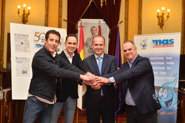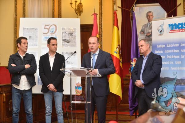El presidente de la Mancomunidad de Aguas del Sorbe, José García Salinas, acompañado del alcalde de Guadalajara, Alberto Rojo; del concejal de Obras del Ayuntamiento de Alcalá de Henares, Manuel Lafront y del representante de los trabajadores de la MAS, Agapito García, han presentado en el salón de Plenos de la capital alcarreña, los actos conmemorativos del 50 aniversario de la Mancomunidad. “Hemos querido hacerlo aquí, en el lugar donde se constituyó oficialmente la MAS un 9 de febrero de 1970, ayer hizo 50 años, y donde se celebró la primera asamblea”, ha asegurado García Salinas, “porque con este gesto queremos rendir homenaje a todos aquellos que hicieron posible este proyecto que tanto ha contribuido al desarrollo de nuestros municipios y del Corredor del Henares”.
