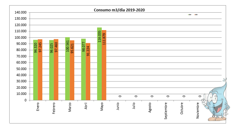 En los cinco primeros meses de 2020, el volumen de agua consumido en los municipios que conforman el territorio MAS ha sido de 15222961 m3, lo que supone una disminución del 2,44% con respecto al mismo período del año anterior. Se han gastado 0,38Hm3 (380 millones de litros) menos que en 2019, siendo el mes de abril, con una reducción de gasto del 7%, el período de mayor ahorro.