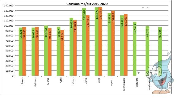 El consumo global de los municipios que forman parte de manera directa o indirecta de la MAS, se sitúa en torno a los 4Hm3 mensuales en los meses de máximo gasto, que suelen coincidir con los meses de calor. Esta cifra disminuye considerablemente con la llegada del otoño y del invierno. Los datos aportados por los técnicos de la mancomunidad indican que el consumo acumulado durante los 9 meses primeros del año natural es ligeramente inferior al de los mismos meses de 2019, concretamente un -2'64%. En ese período de 2019 se consumieron 31,5Hm3, mientras que en este mismo periodo de 2020 hemos consumido 30,7Hm3. "Estamos contentos pero tenemos que ser prudentes" afirma García Salinas. "Estamos orgullosos de poder disfrutar de un agua de bajo coste al ciudadano y de excelente calidad, de las mejores aguas que pueden beberse hoy en España según los informes externos con los que contamos, pero estamos también obligados a ser prudentes porque el agua es un bien escaso y finito y eso no debe olvidársenos nunca cuando abramos el grifo".